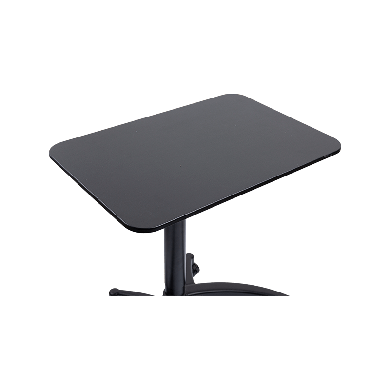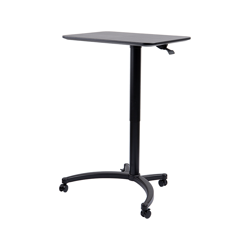 The desk utilizes an integrated gas spring mechanism for height adjustment. Users can manually set the desktop to remain at any height within a vertical range of 720mm to 1130mm. This lifting mechanism operates without electricity, resulting in a relatively simplified construction. The desktop features a square design, measuring 715mm in length and 495mm in width, offering a flat work surface. The main structure is constructed from aluminum and iron, finished with a powder coating process available in black and white color options. The base is equipped with four casters, two of which include locking functions, facilitating easy mobility and secured positioning when stationary.